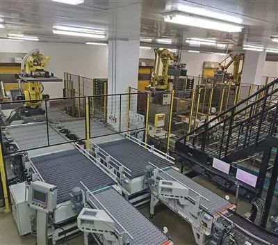 走进天津食品工厂一楼车间,鸡精和鸡粉的生产线正在黑灯的状态下全力运行。设备上方的屏幕,显示着从配料投放、搅拌到包装等全生产链条的实时监控画面。向车间深处走去,一箱箱产品在传送带上快速穿梭。途经分岔口时,有的包装箱会自动拐弯,有的则继续前行。据了解,当红外线扫描到包装箱上的条形码后,包装箱下的轮子会自动升起,使其拐弯或前行。各类产品会按照提前设定的路线,汇集到机械臂工作的区域,再由机械臂进行集中码垛。一个机械臂可以通过识别条形码来同时搬运两种产品……